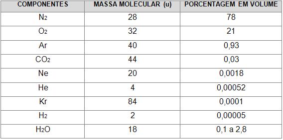 atmosfera. A tabela a seguir mostra os gases que constituem a atmosfera: